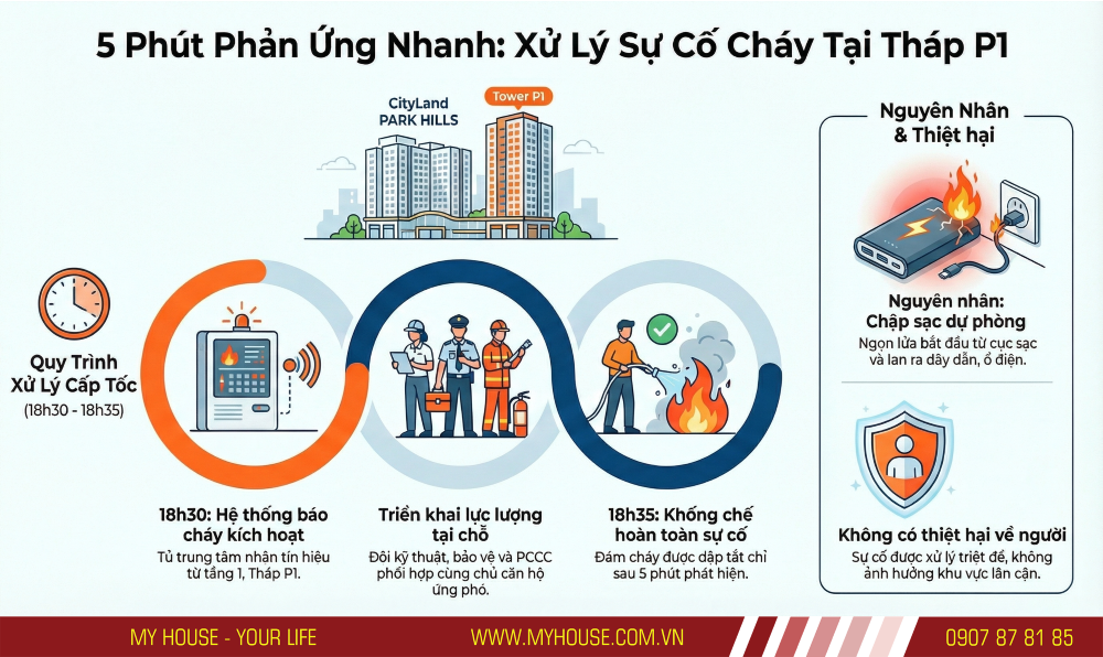 Ngay khi hệ thống báo cháy kích hoạt, lực lượng Ban Quản lý đã nhanh chóng triển khai phương án xử lý. Nhờ sự phối hợp kịp thời giữa các bộ phận chức năng và cư dân, sự cố được khống chế trong thời gian ngắn, không gây thiệt hại về người và không ảnh hưởng đến kết cấu tòa nhà.