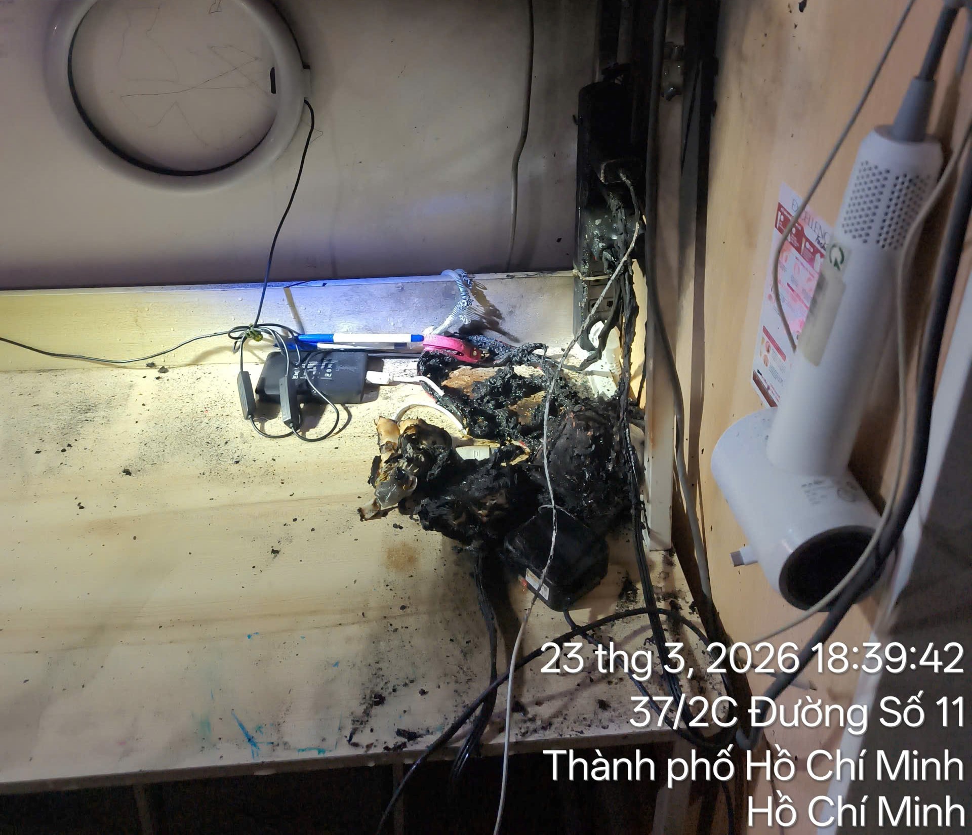 Ghi nhận thực tế, vào chiều tối ngày 23/03/2026, tại một căn hộ trên địa bàn TP.HCM đã xảy ra sự cố cháy cục bộ. Nguyên nhân ban đầu được xác định xuất phát từ việc chập điện của sạc dự phòng, dẫn đến phát sinh lửa tại khu vực ổ điện và các thiết bị lân cận.