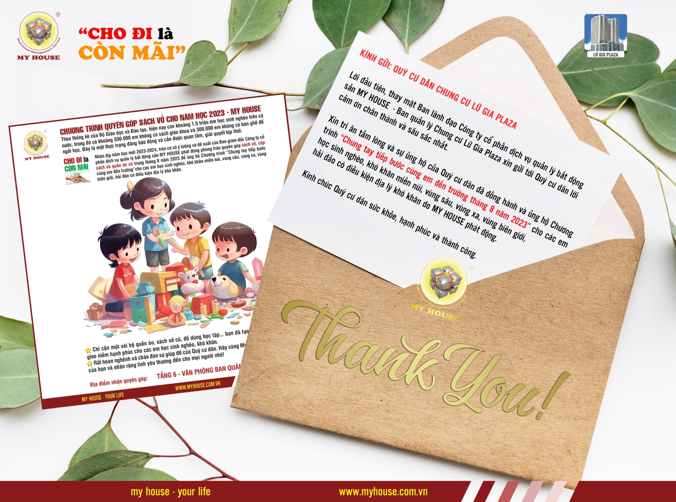 Lời đầu tiên, thay mặt Ban lãnh đạo Công ty cổ phần dịch vụ quản lý bất động sản Nhà Tôi - MY HOUSE xin gửi lời cảm ơn chân thành nhất đến Quý cư dân, những mạnh thường quân đã ủng hộ nhiệt tình bằng vật chất và tinh thần cho chương trình “Chung tay tiếp bước cùng em đến trường tháng 8 năm 2023” cho các em học sinh nghèo, khó khăn miền núi, vùng sâu, vùng xa, vùng biên giới, hải đảo có điều kiện địa lý khó khăn do MY HOUSE phát động.
