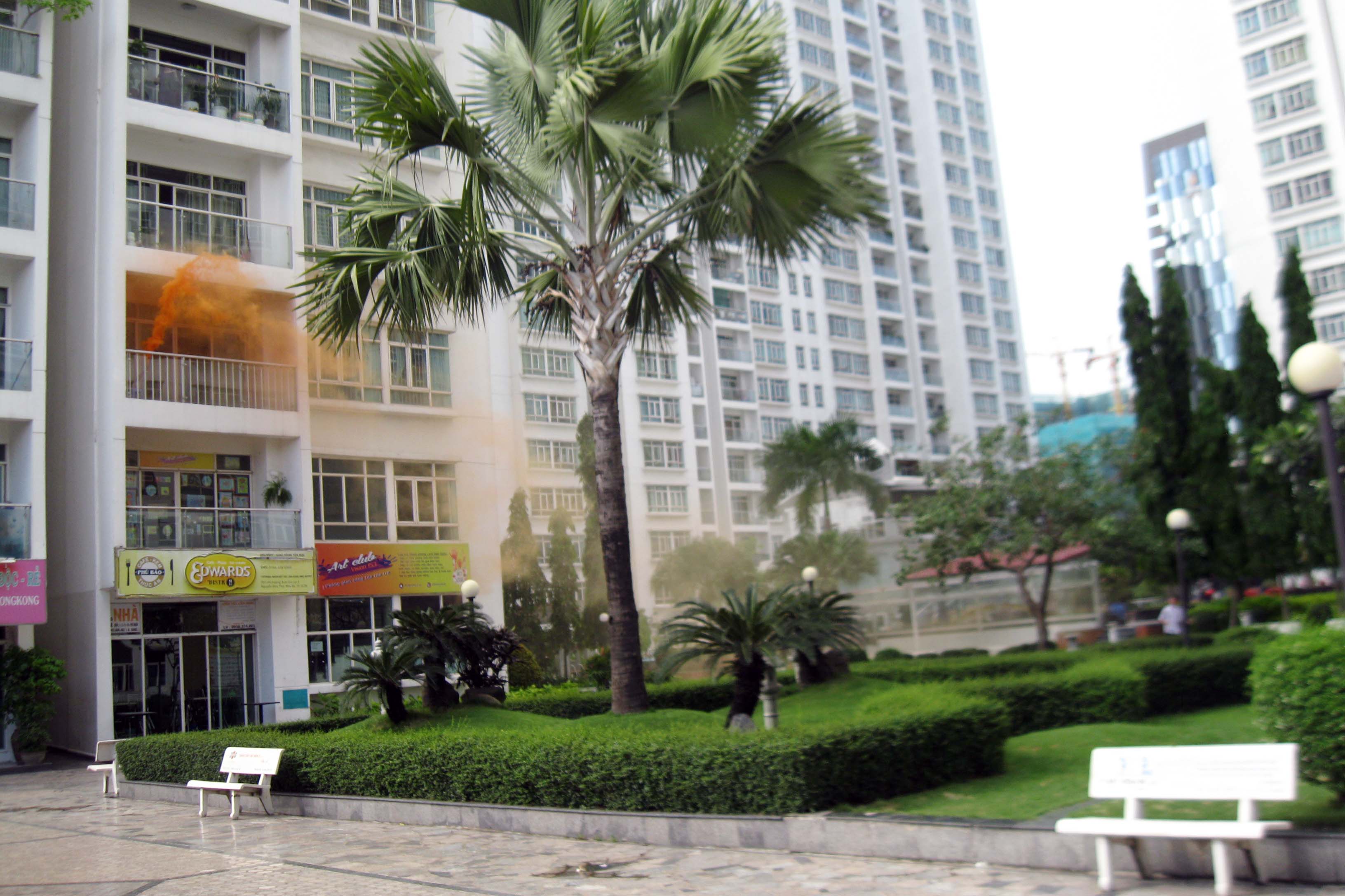 Vào lúc 14g30, tình huống cháy xảy ra tại căn hộ tầng 3 Lô D và khói lan tỏa ra ban công.