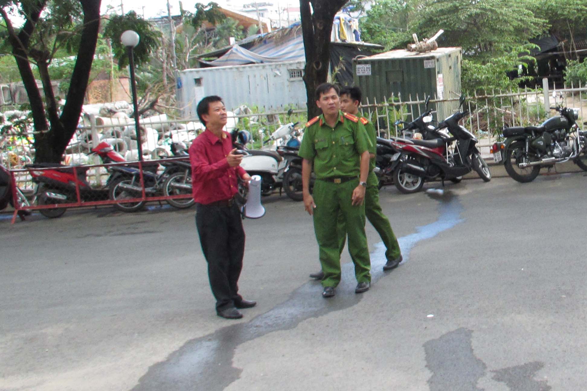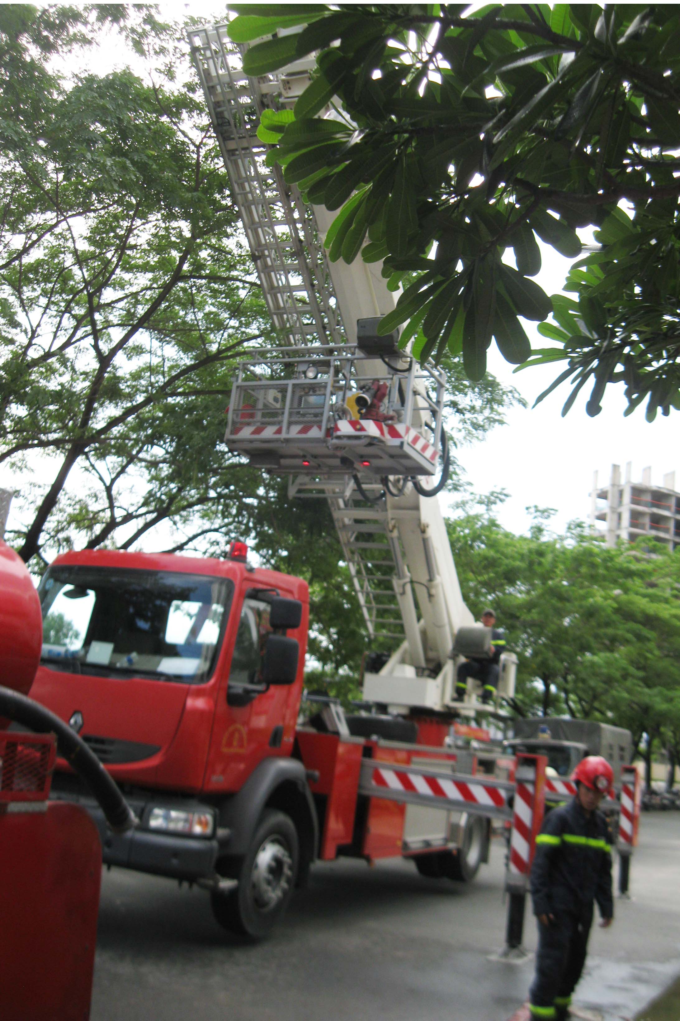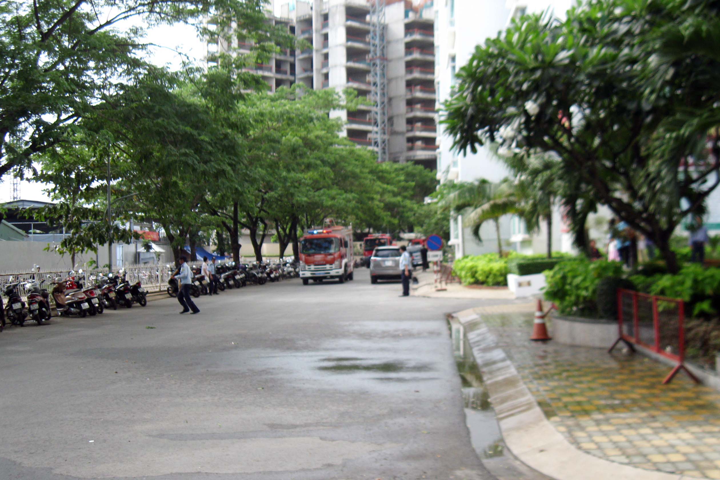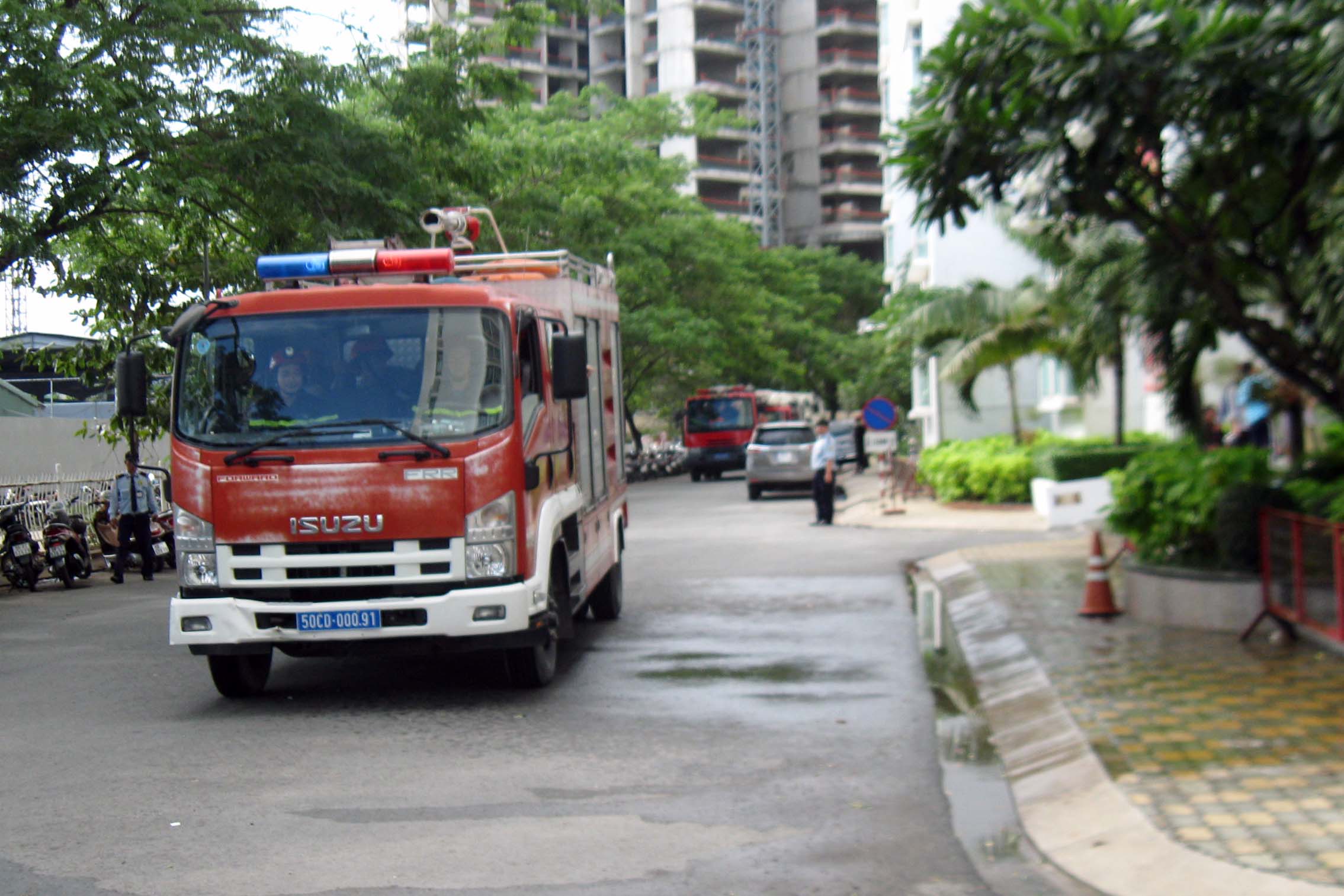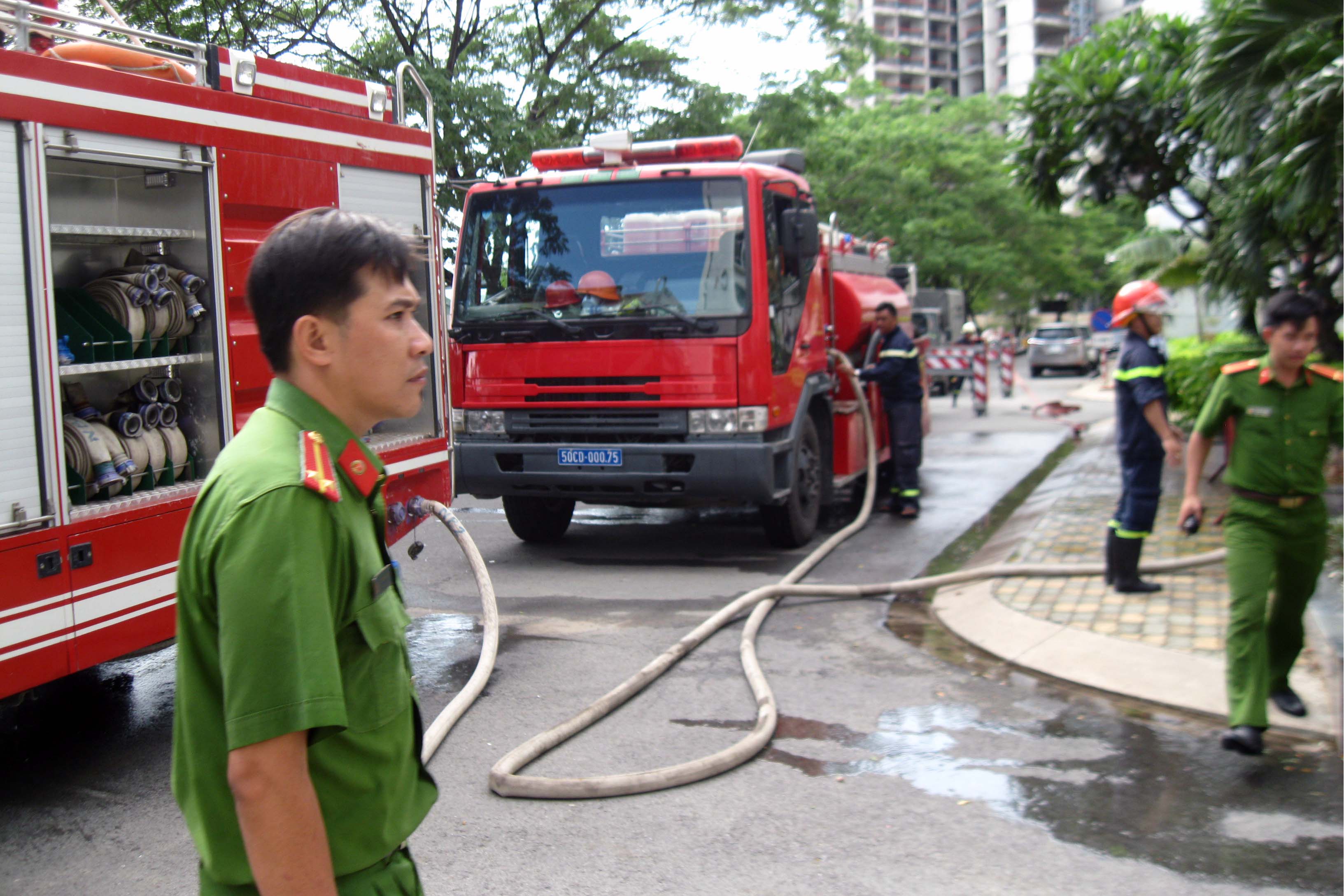 Sau 5 phút kể từ khi còi báo động vang lên, đội chữa cháy chuyên nghiệp của Công an PCCC huyện Nhà Bè đã có mặt với 3 xe chữa cháy, trong đó có 1 xe thang chuyên dụng để chữa cháy nhà cao tầng.