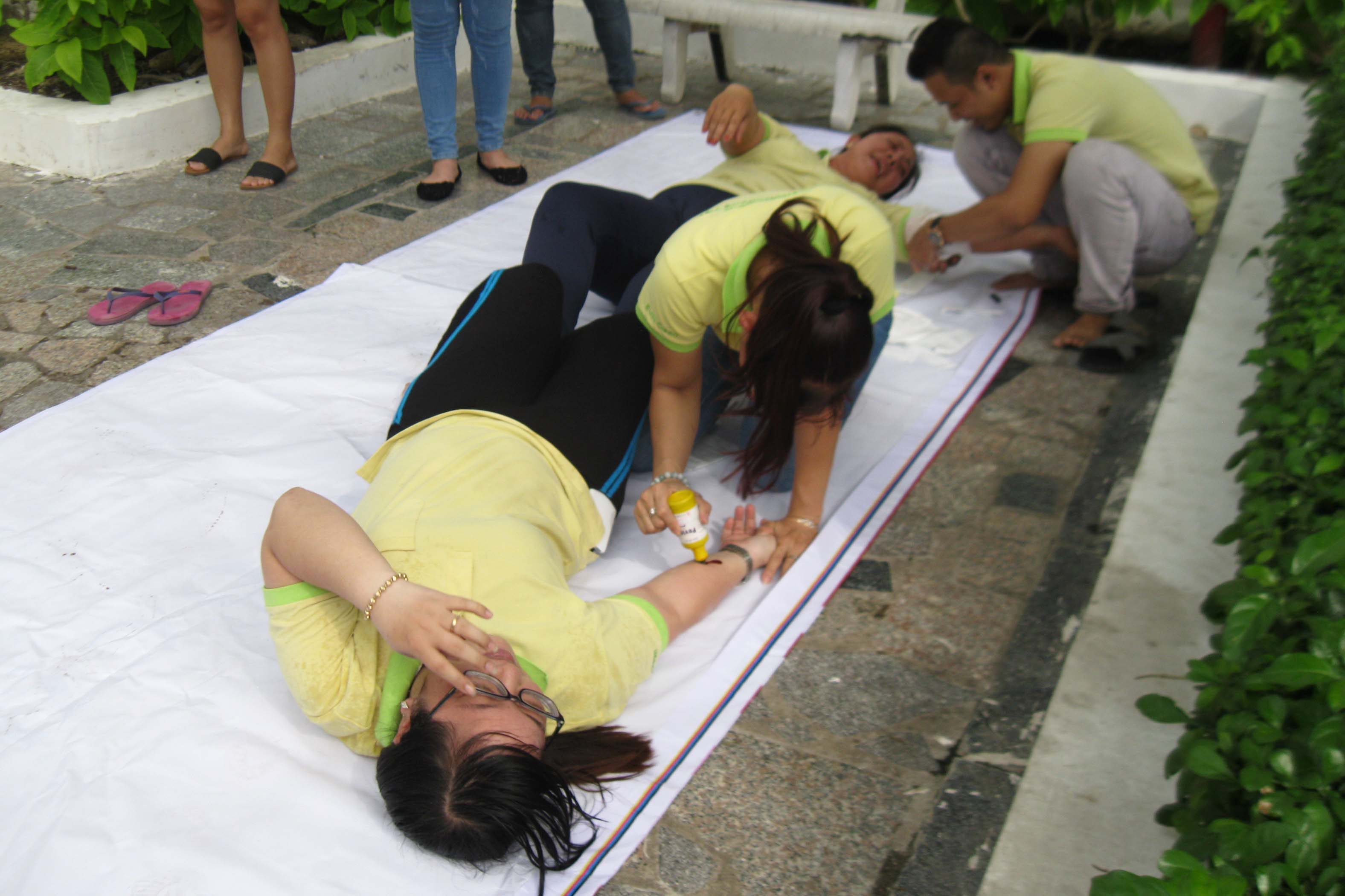 Các nhân viên vệ sinh triển khai việc đưa người bị thương thoát khỏi đám cháy và tập kết đến nơi an toàn để sơ cứu.