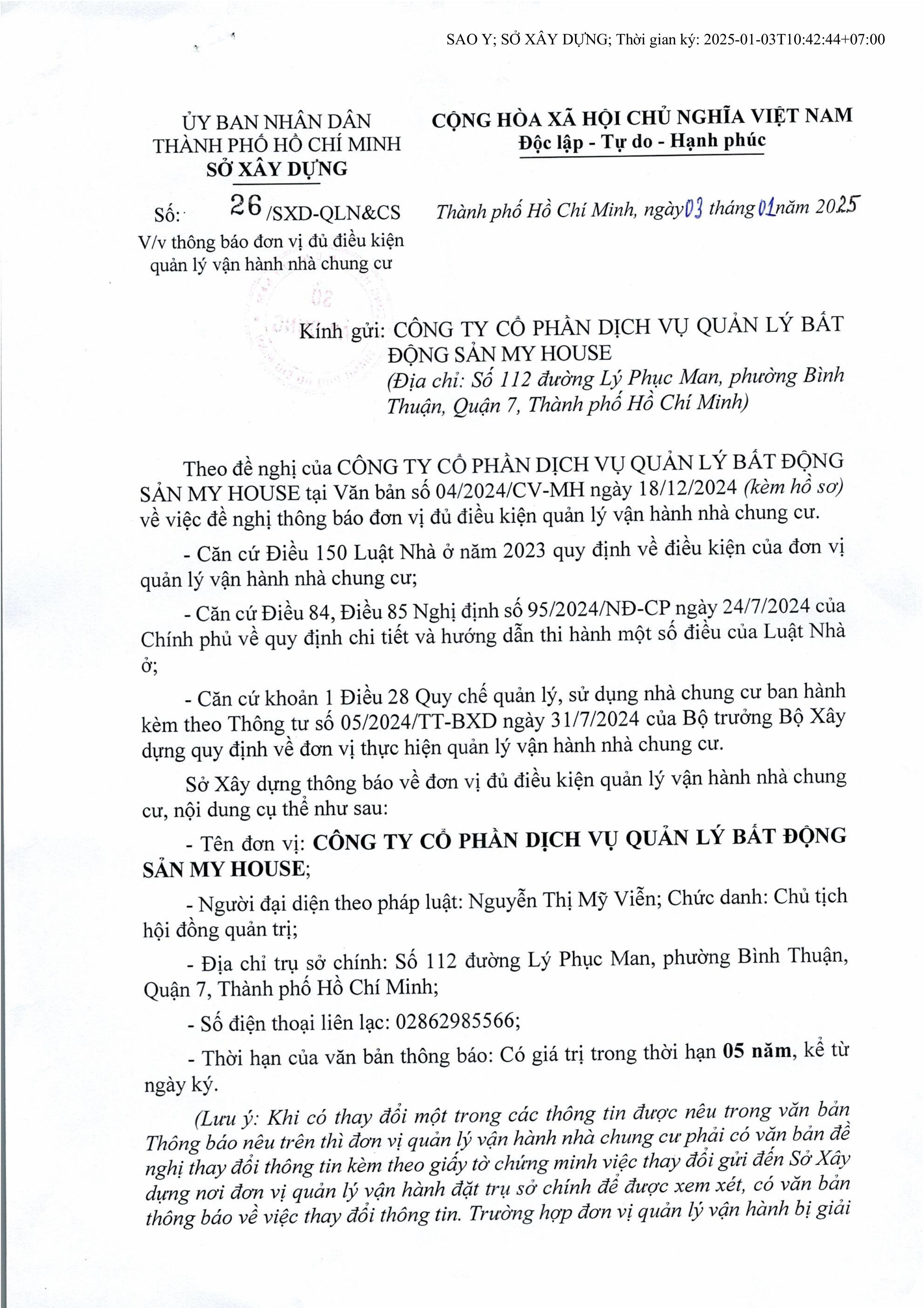 MY HOUSE đã được Sở Xây Dựng TPHCM kiểm tra xác nhân ĐỦ ĐIỀU KIỆN Quản lý Vận hành Nhà chung cư theo Luật Nhà ở mới năm 2023 và được niêm yết trên Công thông tin điện tử của Sở Xây dựng TPHCM.
