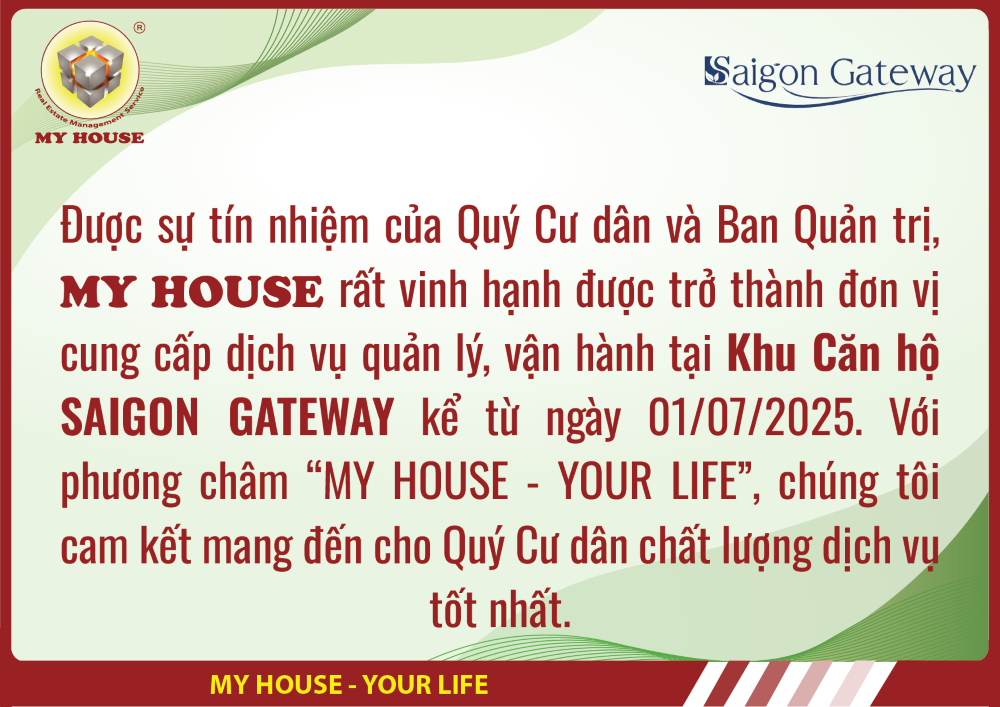 Việc tiếp nhận Saigon Gateway đánh dấu bước tiến quan trọng trong hành trình mở rộng hệ thống dự án của MY HOUSE, đồng thời thể hiện sự tin tưởng từ Ban Quản Trị và cộng đồng cư dân đối với năng lực chuyên môn, chất lượng dịch vụ và sự tận tâm của đội ngũ chúng tôi.