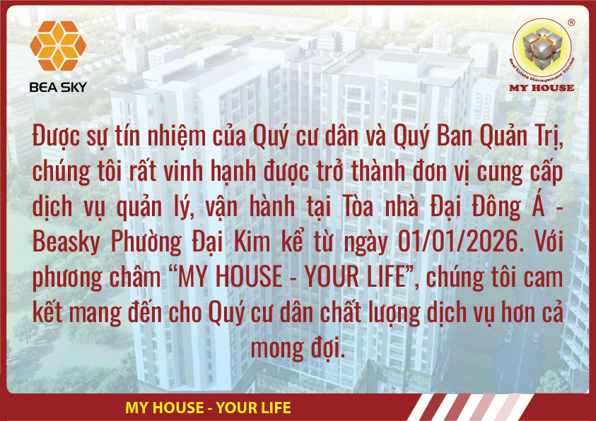 Ngày 01/01/2026, MY HOUSE chính thức tiếp nhận công tác quản lý vận hành Tòa nhà Đại Đông Á - Beasky Phường Đại Kim, mở đầu năm mới bằng một dấu mốc ý nghĩa trong chiến lược phát triển tại thị trường phía Bắc.