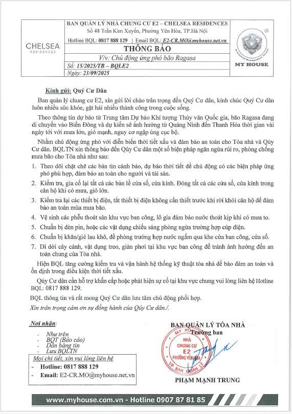 Tại Hà Nội, các dự án do My House quản lý đã và đang tích cực triển khai các biện pháp ứng phó bão, bao gồm: