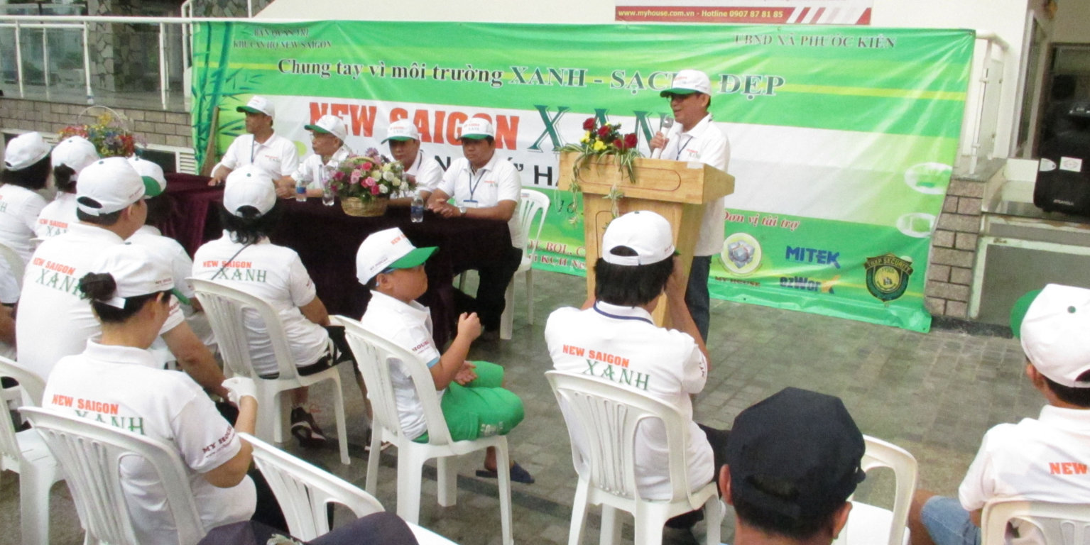 Đúng 7 giờ sáng, Ông Đinh Duy Linh - Trưởng Ban Quản trị tuyên bố lý do phát động chương trình “Chung tay vì môi trường XANH - SẠCH - ĐẸP: NEW SAIGON XANH Lần thứ 2” cũng như vận động cư dân về việc phân loại rác thải sinh hoạt nhằm giảm thiểu ô nhiễm đến môi trường sống.