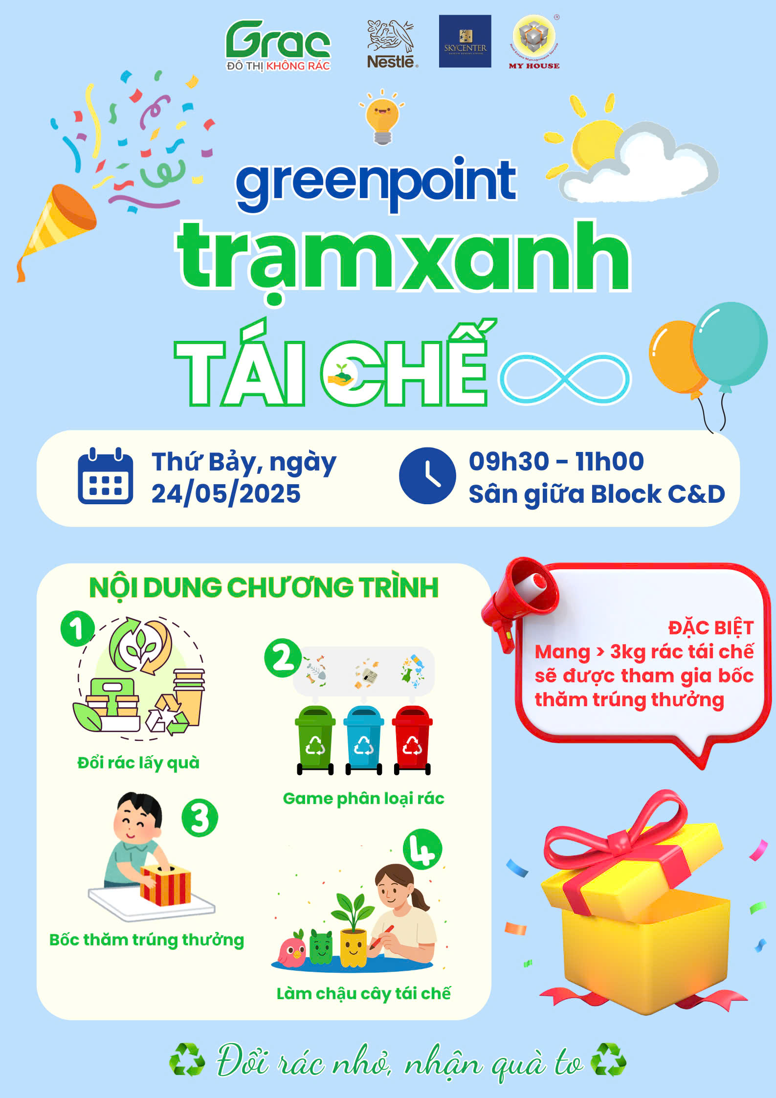 MY HOUSE phối hợp cùng Ban Quản Trị SkyCenter, tổ chức chương trình “Greenpoint – Trạm Xanh Tái Chế”, với sự đồng hành của Đô Thị Không Rác, Nestlé Việt Nam, và các đối tác môi trường.